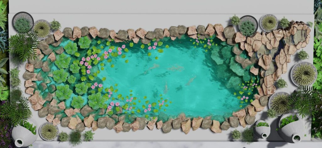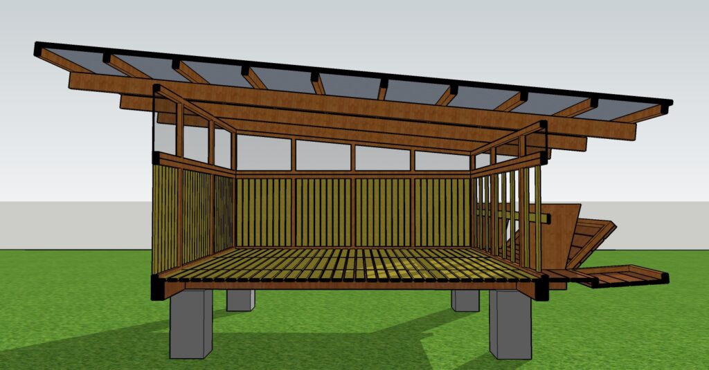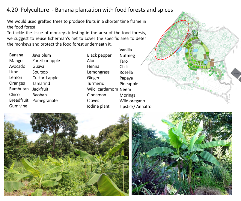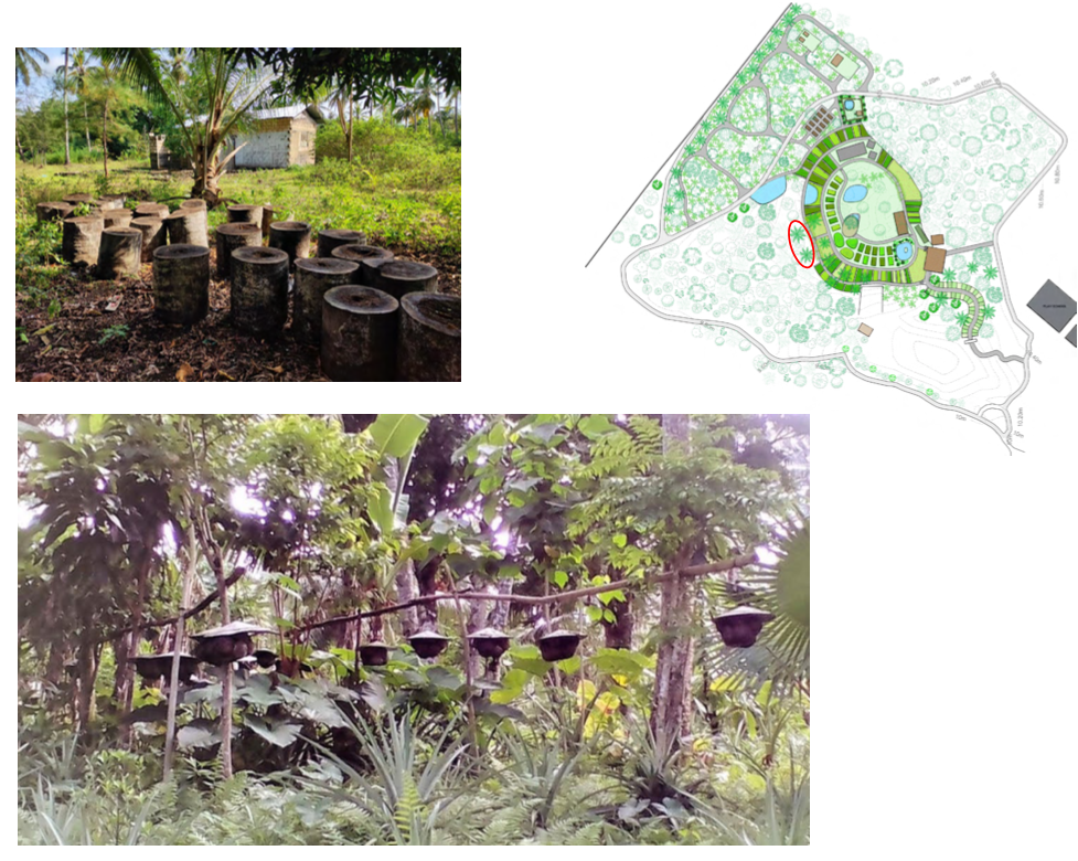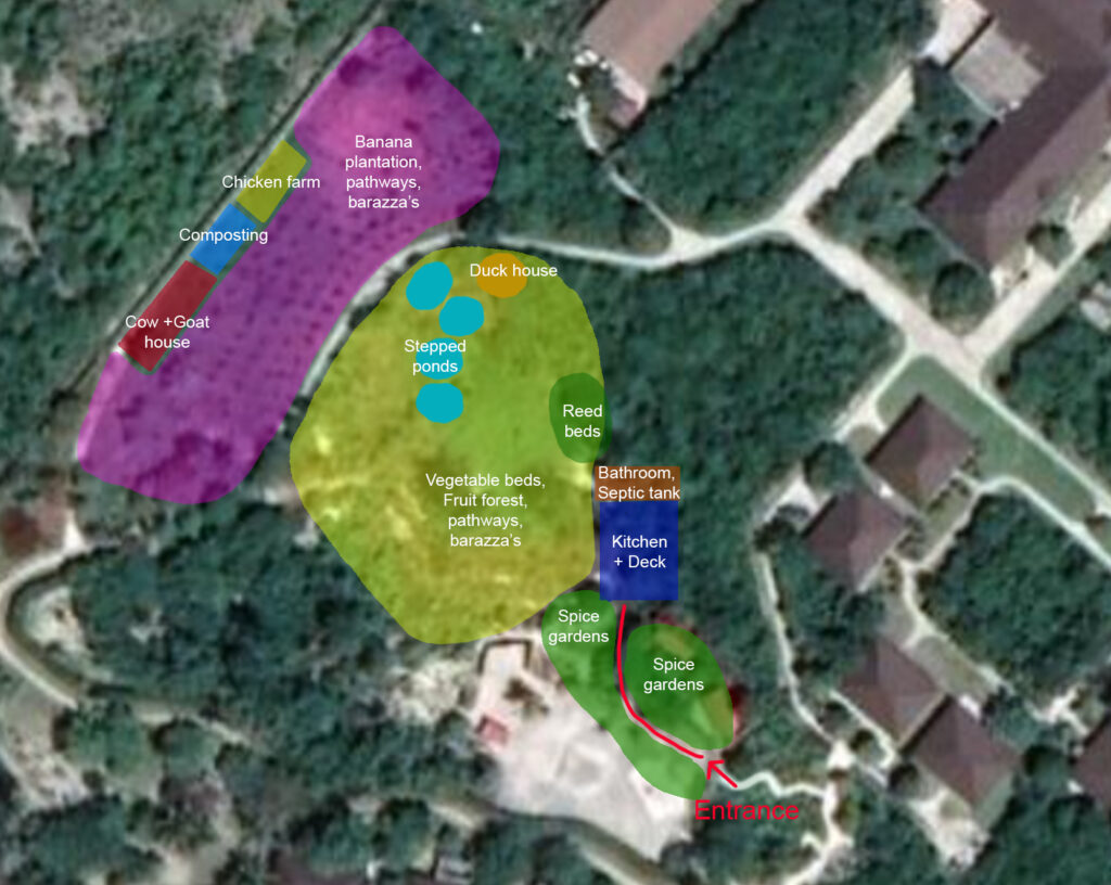 ich acts as a biological water filtration system, where grey water from the toilet and kitchen would be filtered and treated through the reed bed system and then reused to irrigate the trees; a biogas system; a small cosy tree house which will add a thrilling experience to children and adults alike; vegetable beds and trellises as well as terraced vegetable beds including earthbag constructions for retaining walls; an additional open air dining below naturally-shaded Indian almond tree; a terraced ponds with water lilies to enhance biodiversity and wildlife; a nursery with sink and potting table and toolshed; worm beds as they are the foundation of a productive and healthy garden as well as a composting and soil building area. Furthermore a dragon fruit farm; pergolas for walkway and local benches ("Barazza’s"); chicken, goat and duck houses with a pond; stingless bee hives and many shaded cool areas for seating.