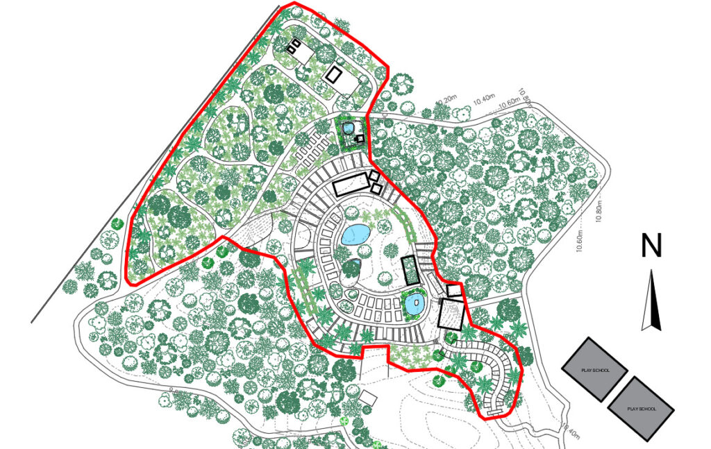 We are setting up the following features: a green archway, symbolizing the portal and entrance to the Earth Basket; a flower, medicinals and herb garden; a kitchen and restaurant with an open toilet replicating similar design elements from the main building to have a sense of connection to the overall design at The Residence, still using natural materials to create a shamba feel; a reed bed, wh